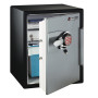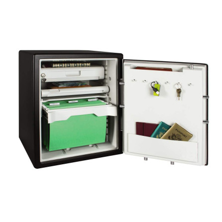 SentrySafe OA387 : ce coffre-fort résiste au feu, pendant 2 heures il protège son contenu jusqu'à une température extérieure de 926.7°C. Il résiste aussi à l'eau en cas d'inondation ou de projection de liquide. Sa condamnation est assurée par 4 pênes actifs de 25 mm de diamètre.