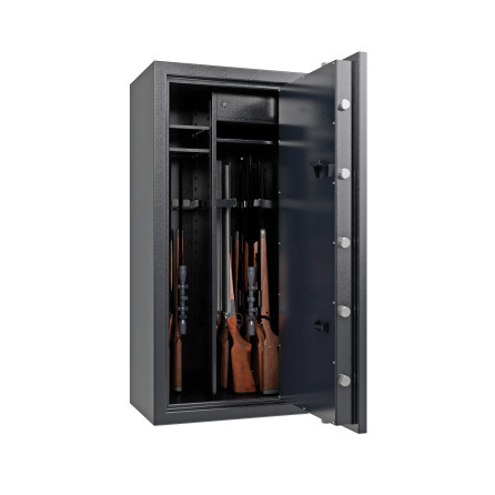 Avec 3 possibilités d'aménagement, ces séries d’armoires fortes pour armes s’adaptent à vos besoins en espace. En effet, elles peuvent accueillir 14 armes longues jusqu’à 1480 mm et leur verrouillage est hautement sécurisé par pênes tournants anti-sciage de 38 mm.